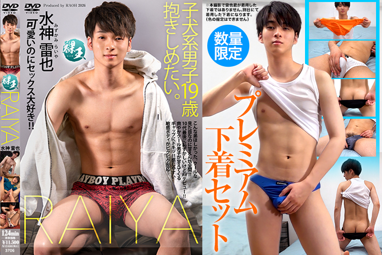 ※ こちらの商品は、らいや君の着用した下着がセットになったコースです。 ①作品中に着用した映像は収録されていません ②色指定はできません ※2026年3月11日まで新作予約30%オフで購入できます。予約特典として POCKET TENGAが1個ついてきます(色指定はできません) 子犬系男子19歳 【水神雷也】ゲイビデオ初登場!! こんな弟ほしかった。クールな見た目なのに甘えん坊全開!! 10代最後に恥ずかしいけどAVデビュー!!。 爽やかクール男子が甘えてくるギャップにドキッ!! 感じやすい敏感ボディがビクビク反応… こんなに可愛いのにセックス大好き!! 恥ずかしいけど僕の全部見せます。 ■CHAPTER1 神フェラヌキ 公園で出会った爽やかイケメンに一目で胸キュン!! 笑顔が可愛すぎて、初撮影なのに緊張しながらもずっとニコニコ。 ノンケのはずなのに、いやらしい舌使いの神フェラで男性をイカせてしまう…! 敏感な反応に自分も興奮しちゃう初々しい姿に注目!! ■CHAPTER2 目隠しサカユニSEX サカユニ姿が眩しくて可愛すぎる雷也君。 目隠しをされて視界を奪われながら、いやらしく乳首やアナルを執拗に責められると… もう我慢できずグチョグチョに濡れちゃう! 敏感な穴がヒクヒク反応して、喘ぎ声が止まらない初々しい姿にドキドキ!! ■CHAPTER3 制服プレイ with るいや 超人気のるいや君とイチャイチャSEX!! 爽やかイケメン同士の制服姿で絡み合う姿にドキドキ! 最初は優しいキスから始まり、だんだん舌を絡めて激しく求め合う…最高にエロい! るいやのアナルにゆっくり挿入すると、雷也君が甘い声で喘ぎながら腰を振り始める。 ■CHAPTER4 競パンアナル萌え 競パン姿の雷也くん、もっこりが激萌え!!ピチピチの生地に包まれた股間がエロすぎ! マッチョ兄貴にいやらしく愛撫されると、体が何度もビクビク反応。 ちんぽはビンビンに勃起しちゃって…。 いやらしい体位でアナルをグチュグチュに掻き回されると、甘い喘ぎが止まらず感じまくり!